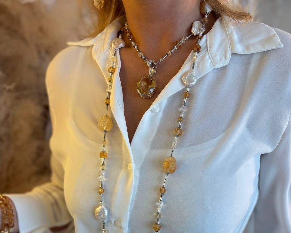 Магия цитринов действует на нас поразительно позитивно и положительно! Витамины наверно не синтезируется,😉 но оптимизм точно укрепляется!) Сотуар можно комбинировать с чокерами, подвесами, элегантные серьги также будут прекрасным дополнением! Длина 1.40 см. Кулон приобретается отдельно!