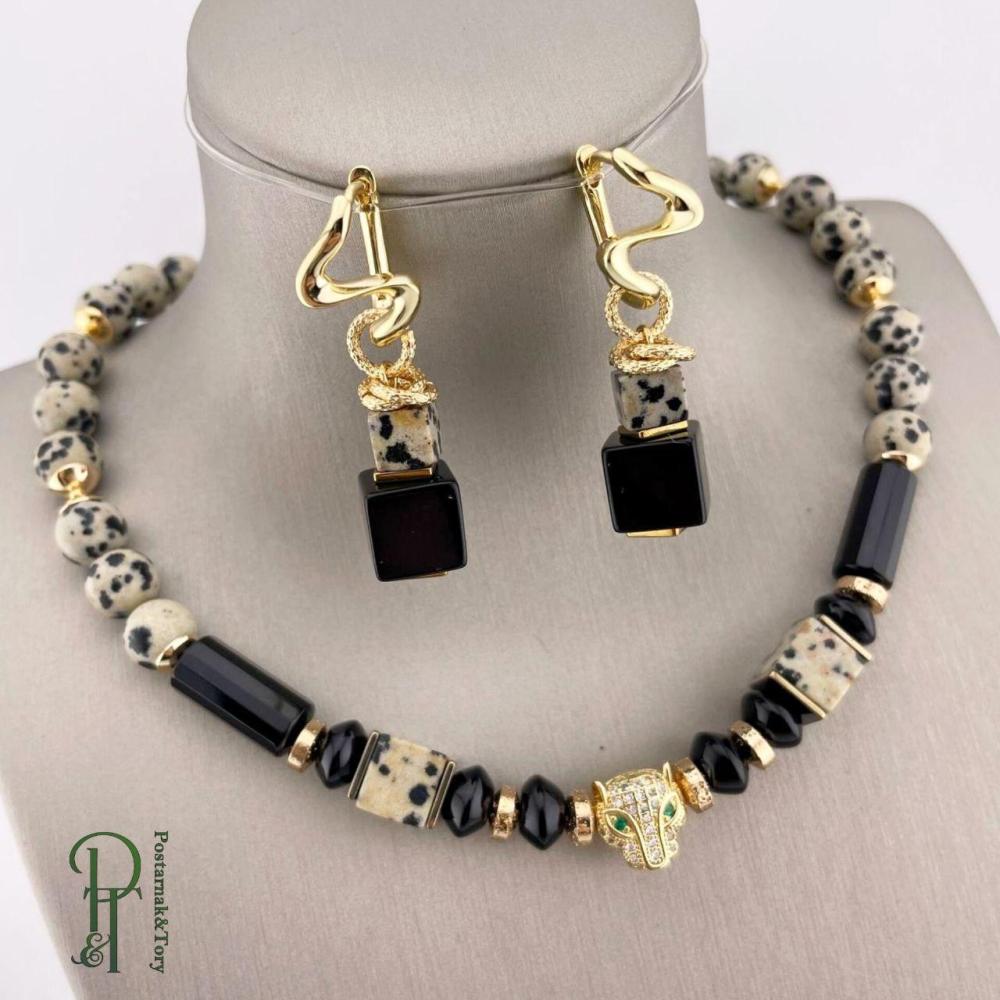 "Чокер ""Шарлиз"" в эффектном сочетании яшмы далматин, оникса и леопарда с центре. Длина 39 см + цепочка на удлинение. Возможно сделать в другом размере.
