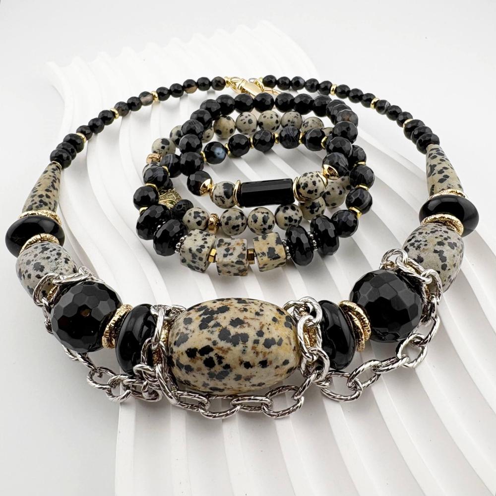 Материалы: далматиновая яшма ( вулканическое происхождение), черный агат, оникс. Размер центрального камня 30*22 мм. Фурнитура Корея premium.