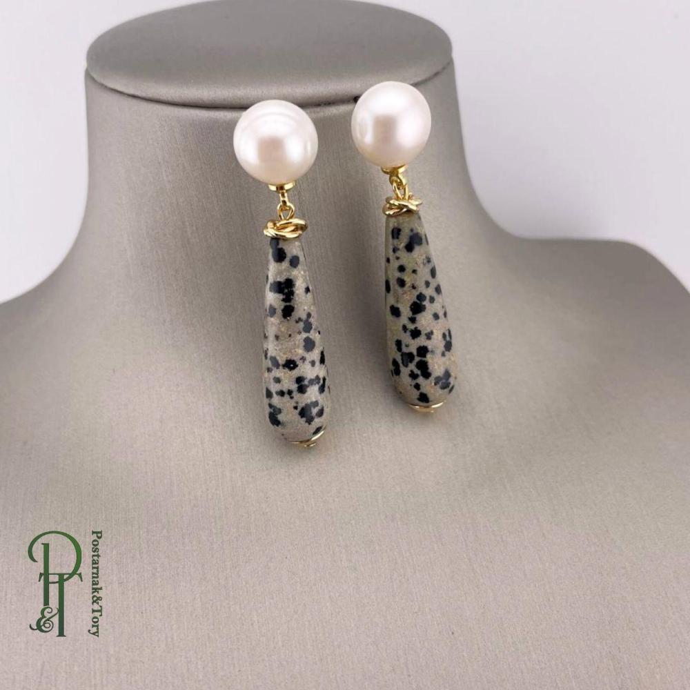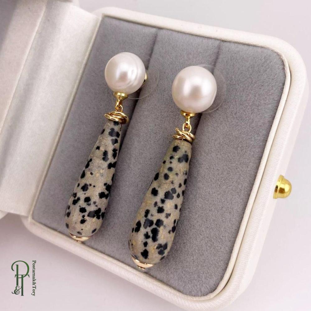 Невероятно стильные и эффектные пусеты с природным культивированным жемчугом и далматиновой яшмой вашему вниманию! Длина 60 мм, 6.5 г вес серьги. Фурнитура премиум Корея. (Цвет металла: серебро, золото)