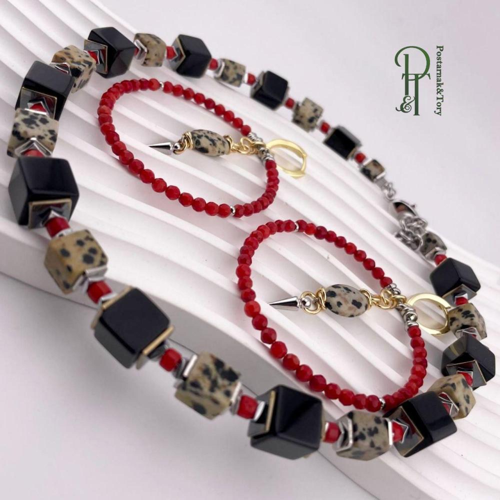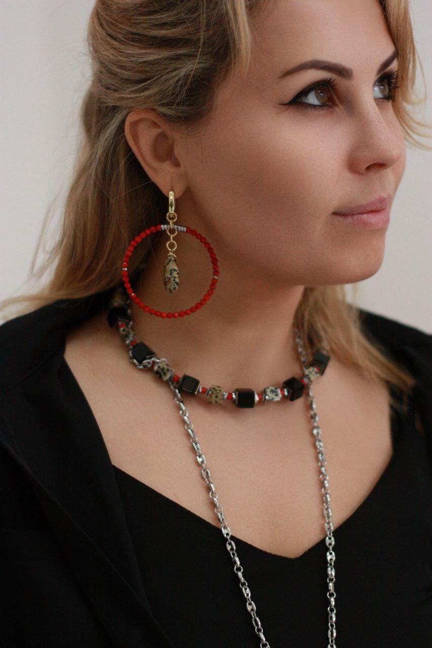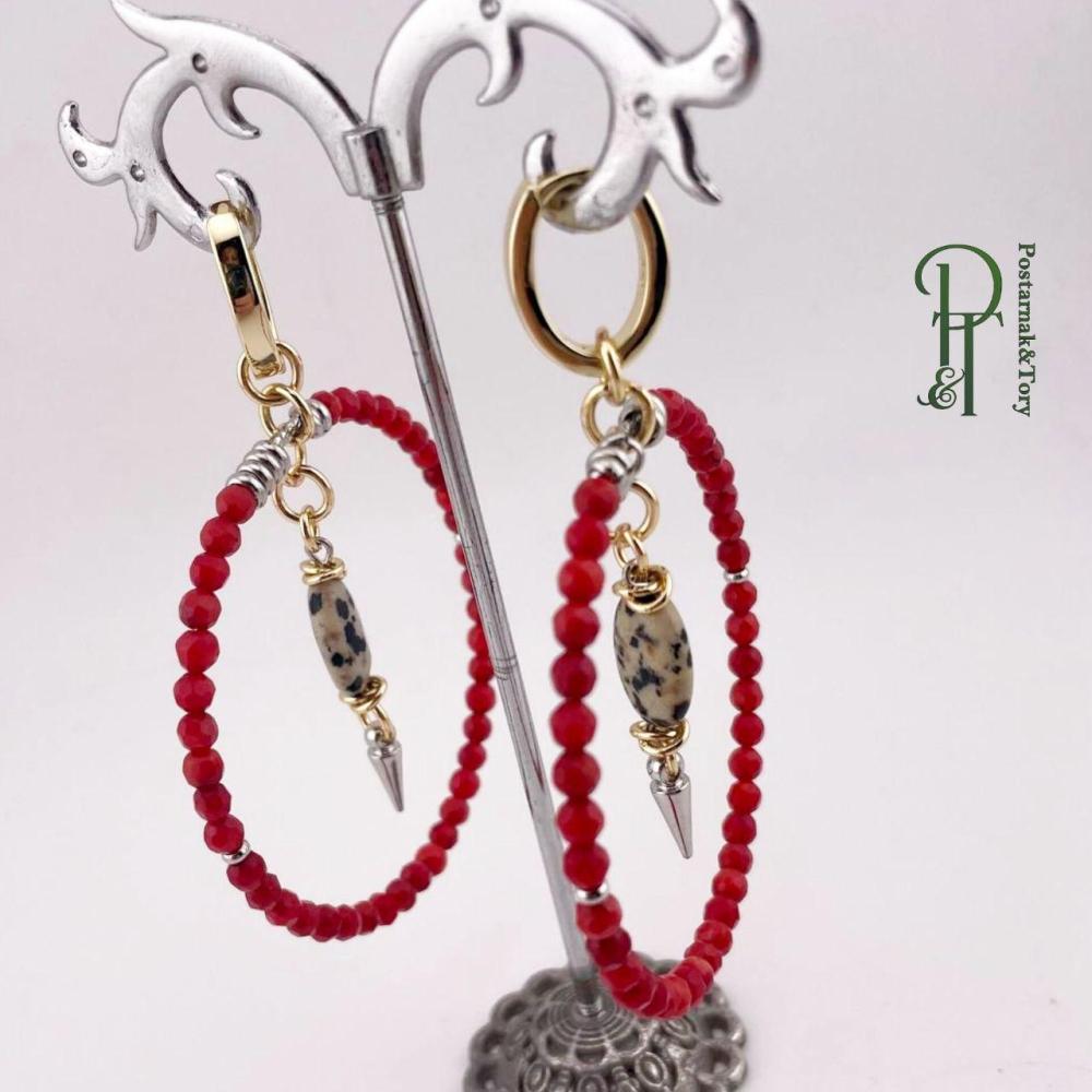 Стильные серьги-кольца красный коралл & яшма далматин.