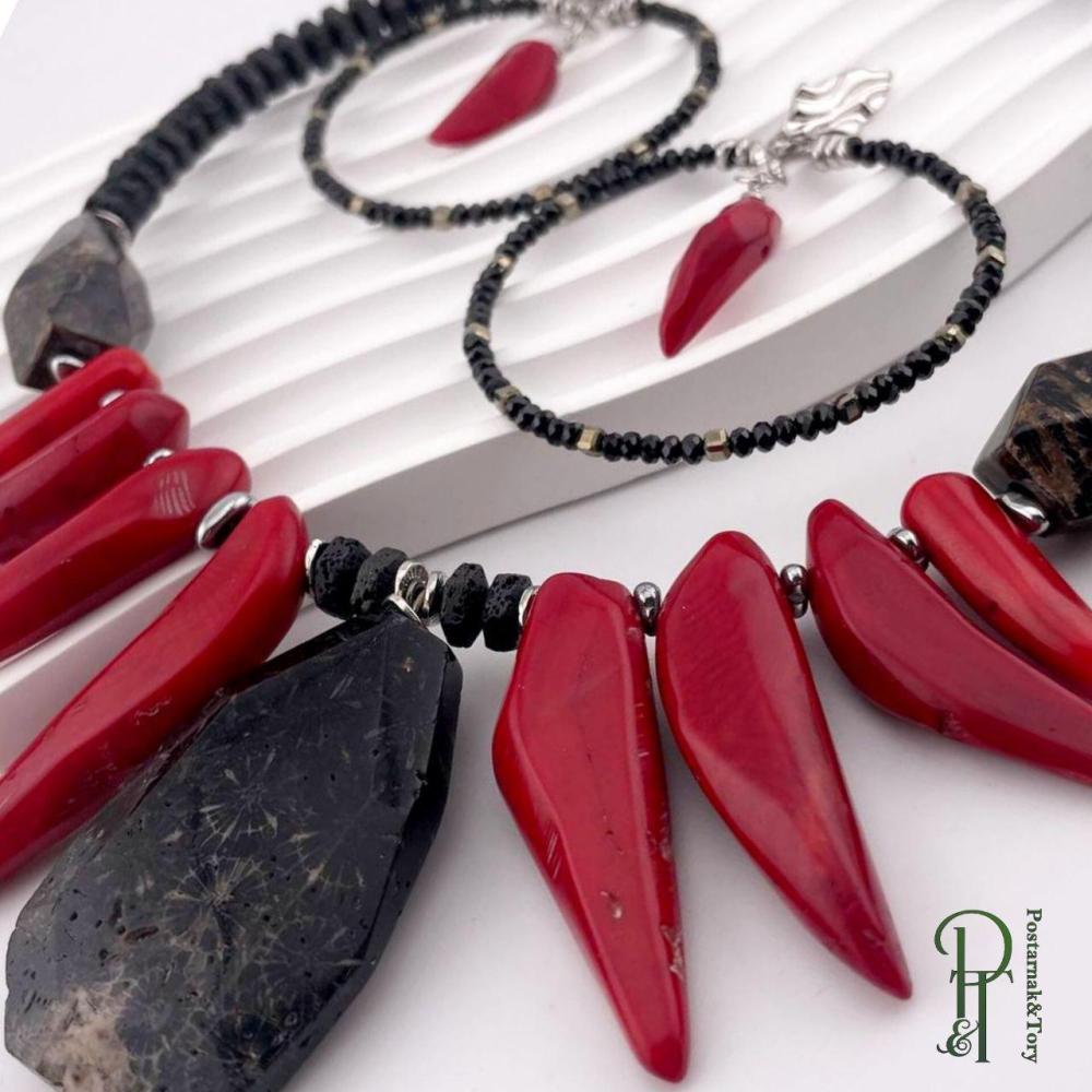 Восхитительные серьги-кольца с черным турмалином и красный кораллом.