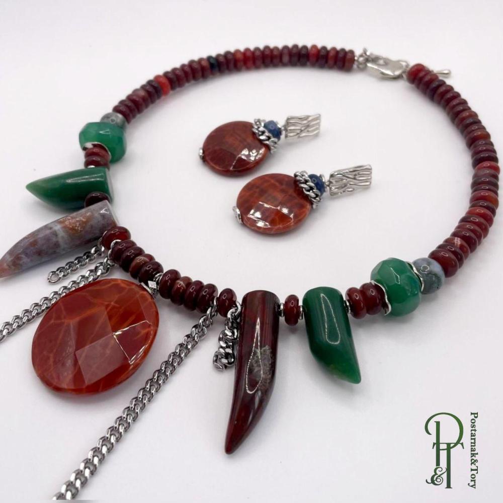 В украшении используются природные камни - яшма гелиотроп, сердолик, огненный агат. Цепи добавляют украшению динамичности, объединяя этнику и современные тенденции!