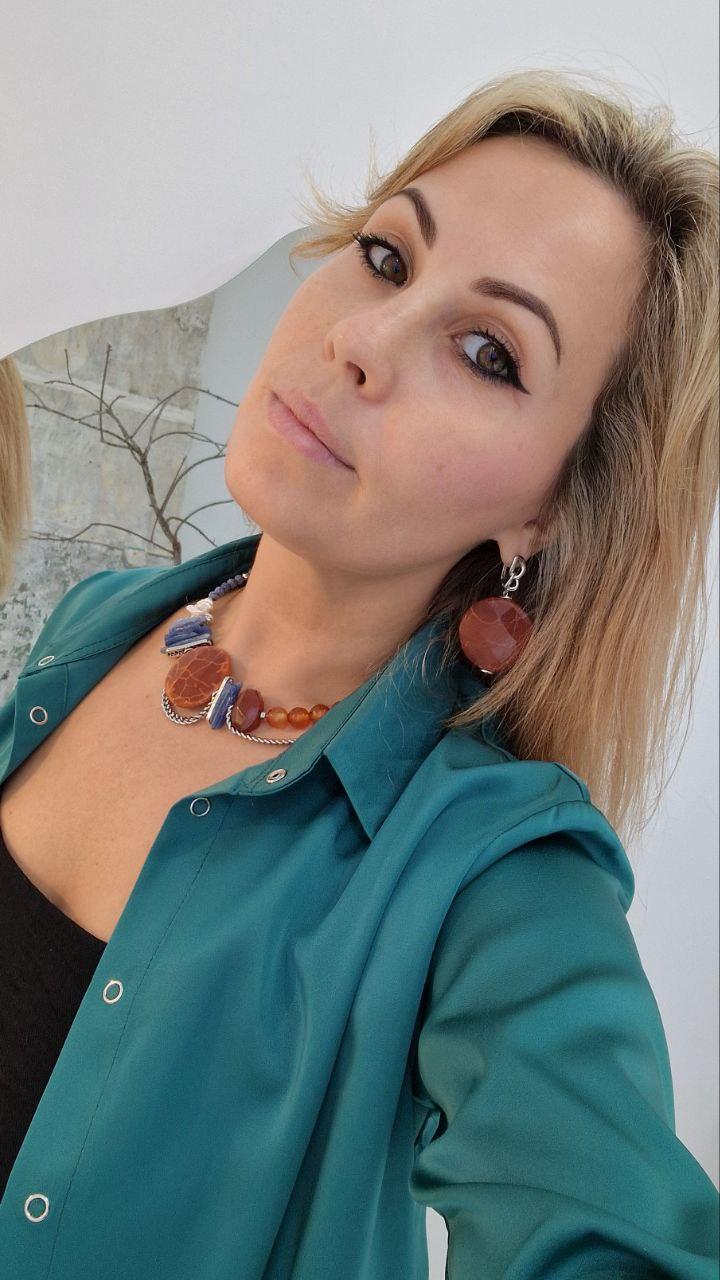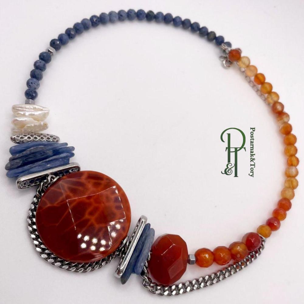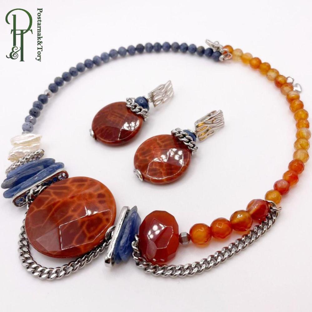 В центре крупный агат с красивым принтом и слева яркий сердолик - что олицетворяет огненную стихию, а справа стихия воды в исполнении кианита, жемчуга и голубого коралла.