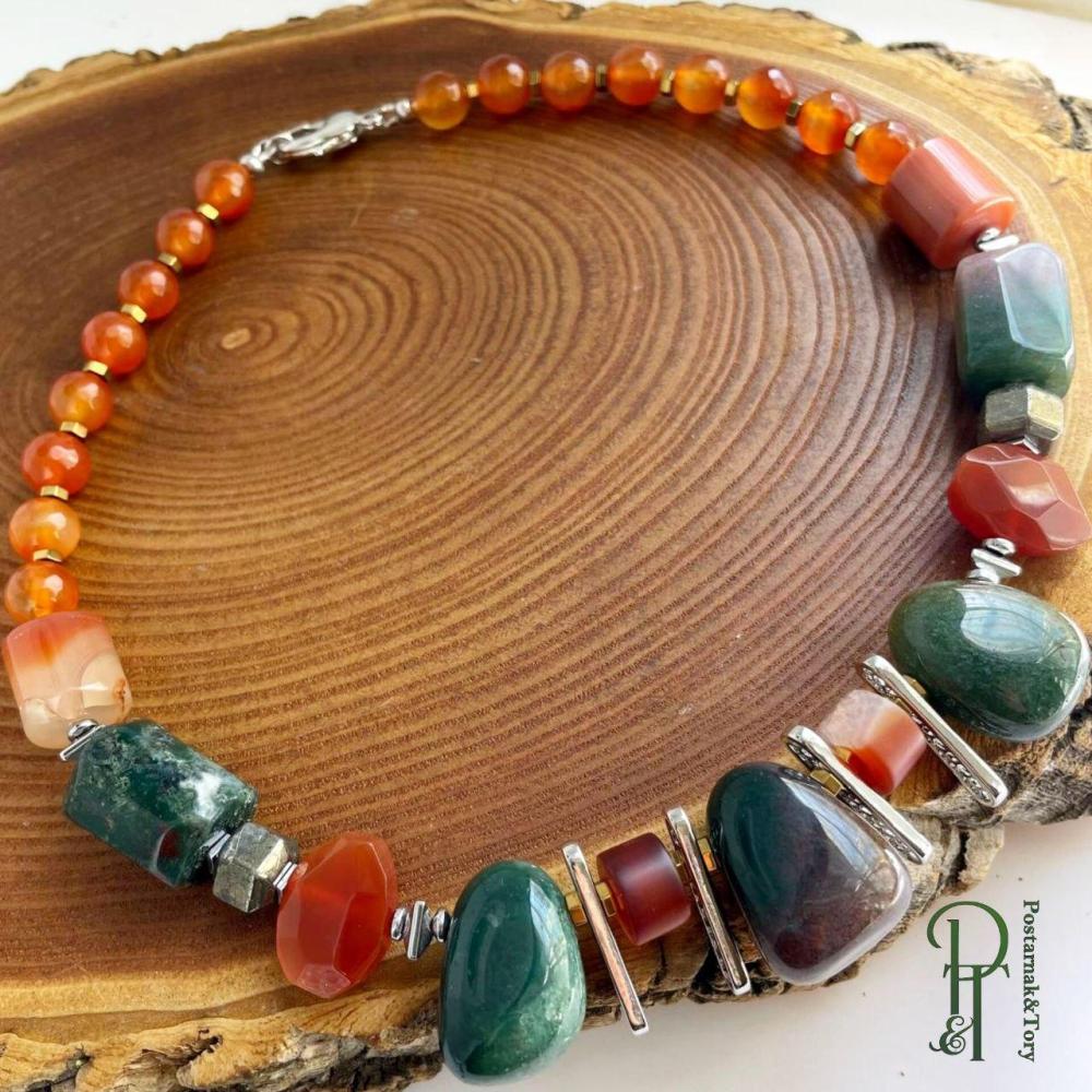 Темно-зеленая яшма благородных оттенков красиво сочетается с сердоликом терракотового цвета.