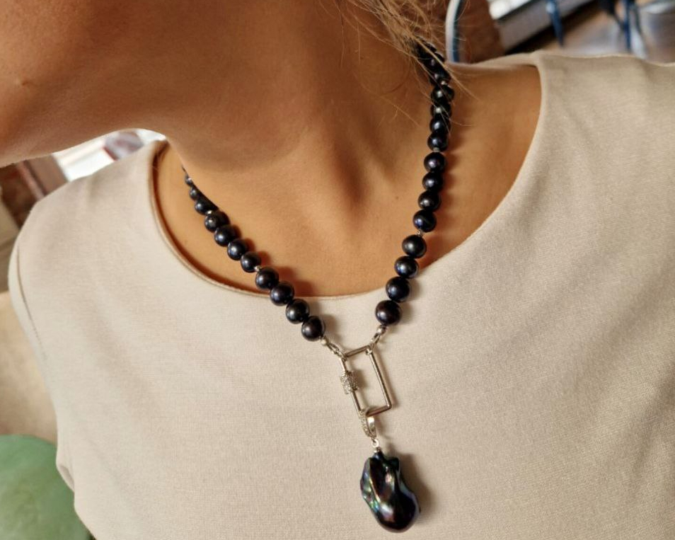 Стильное жемчужное колье-трансформер с крупным подвесом из жемчуга барокко. К колье в комплект прилагается сменный держатель круглой формы (входит в стоимость). Если Вам хочется больше экстравагантности - держатель прямоугольной формы, хочется больше классики - круглый держатель.