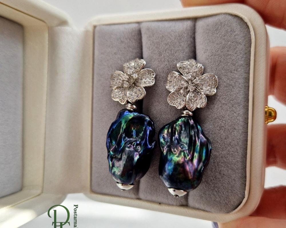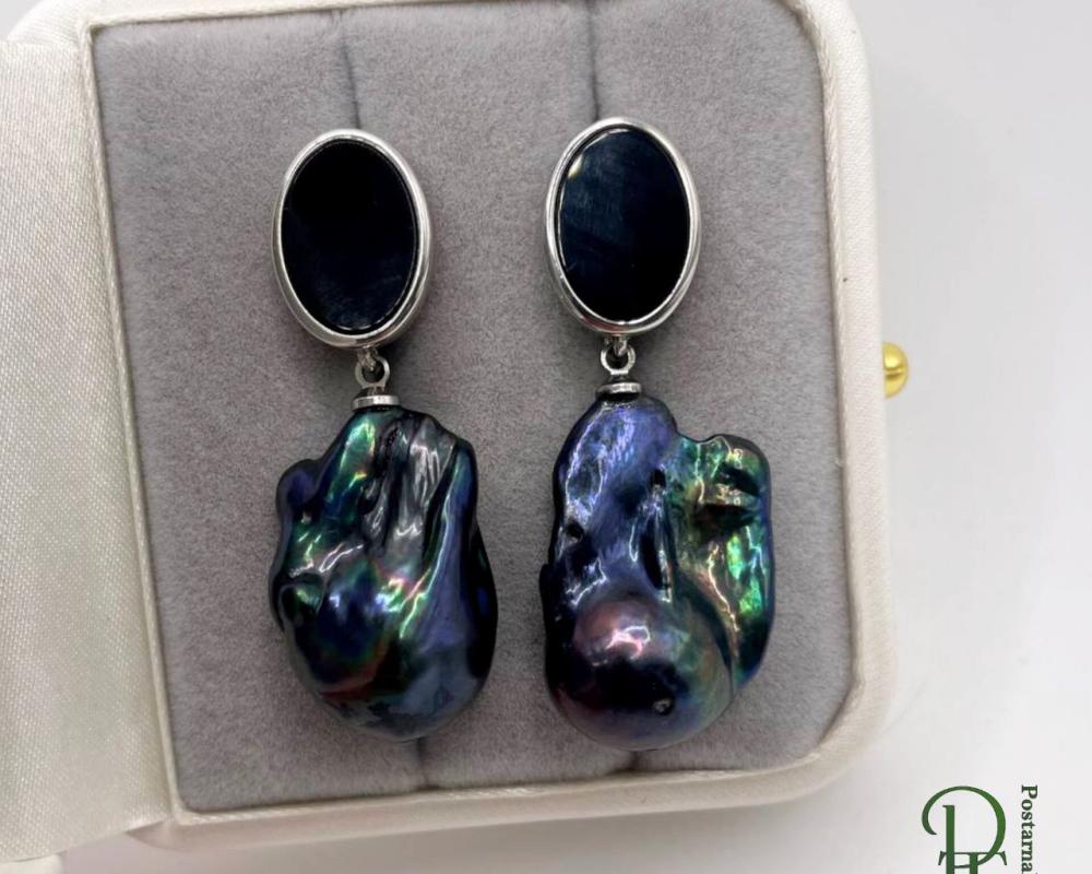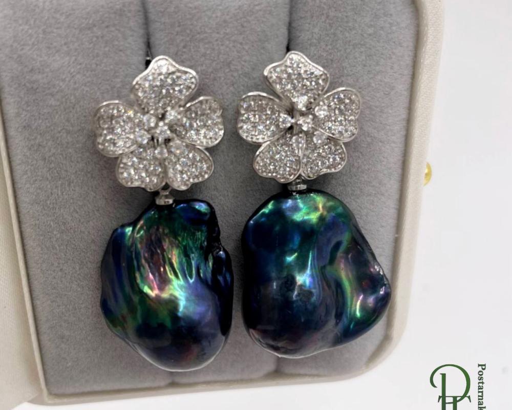 Представляем шикарные серьги с жемчугом барокко. С первых секунд взгляд завораживает невероятный люстр с преобладанием зеленых переливов.