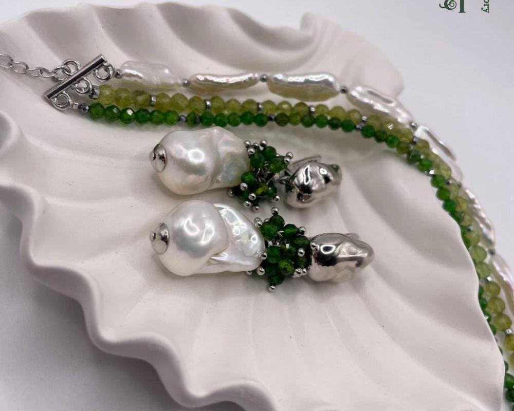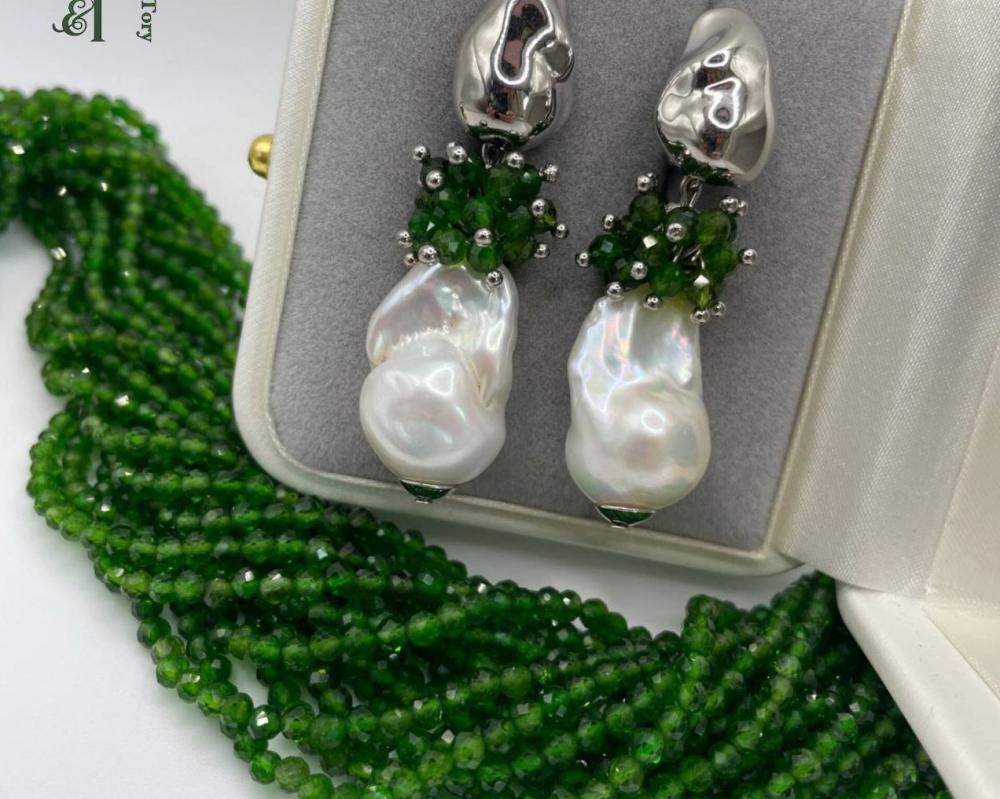Серьги с хромдиопсидом и жемчугом барокко вашему вниманию. Вес одной серьги 10гр, длина 5 см. Возможно выбрать другие швензы, а также сделать с фурнитурой под золото.