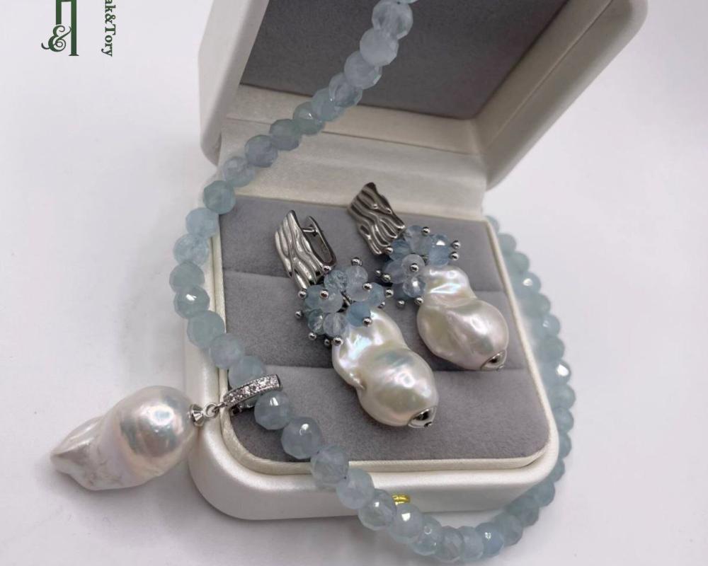 Нежный чокер из аквамарина с жемчужиной барокко идеально дополнит серьги.